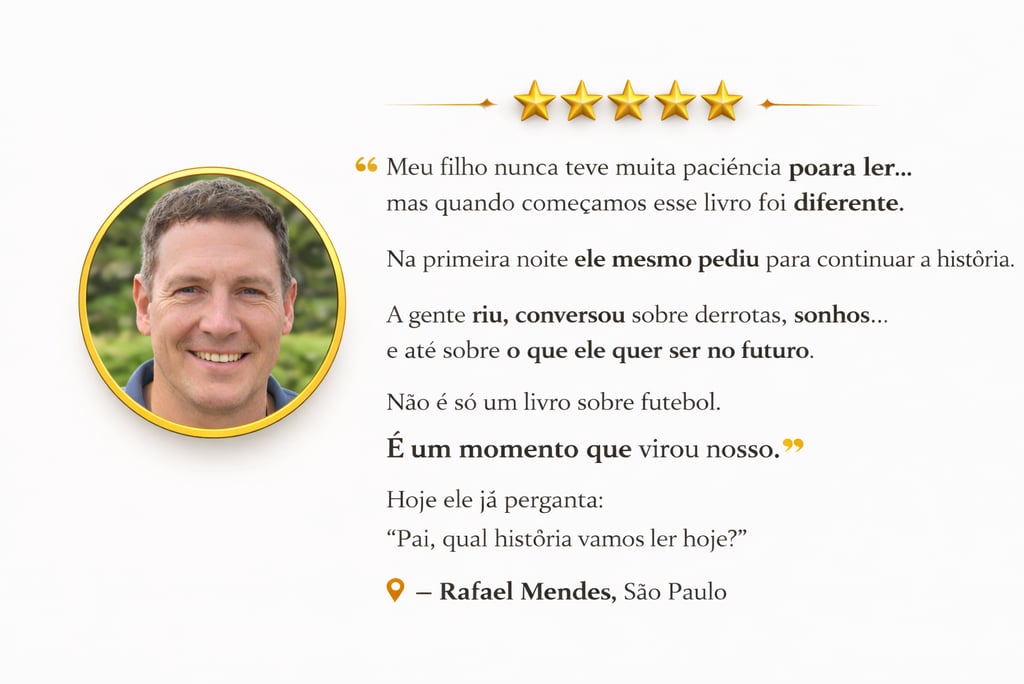 Mais do que ensinar sobre futebol, este livro aproxima pais e filhos e cria momentos que ficam na memória. Conversas sobre emoções, escolhas, derrotas, recomeços e sonhos — de forma leve, natural e verdadeira.