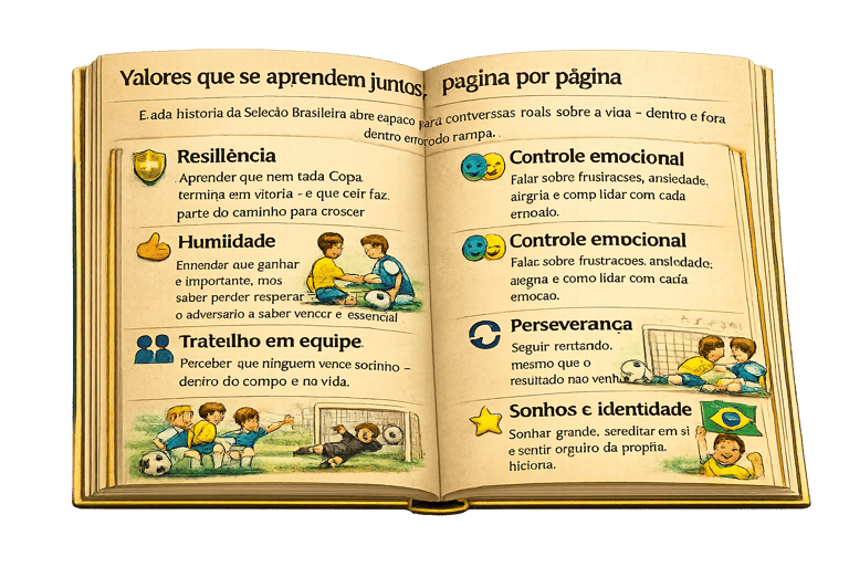Cada história da Seleção Brasileira abre espaço para conversas sobre resiliência, humildade, trabalho em equipe e perseverança — valores que moldam caráter dentro e fora do campo.